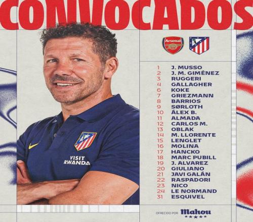 雷速体育10月20日宣 西甲豪门马德里竞技公布了欧冠客场对阵阿森纳的大名单。