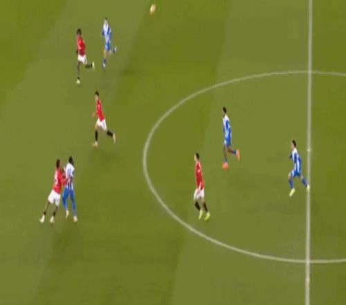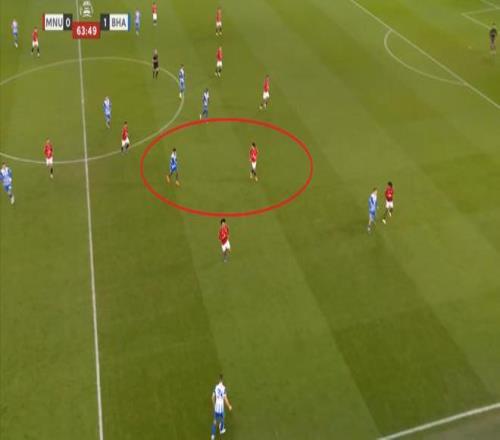 就会发现,曼联在第一线摆出了谢什科和布鲁诺,芒特则和库尼亚一起负责两翼,然后问题出在梅努和乌加特两人全部进入布莱顿的30米区域。