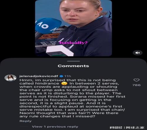 德约科维奇的妻子伊莲娜对这一判罚显然不满,公开抨击球员和裁判,认为这种“缺乏尊重”的做法被纵容了。