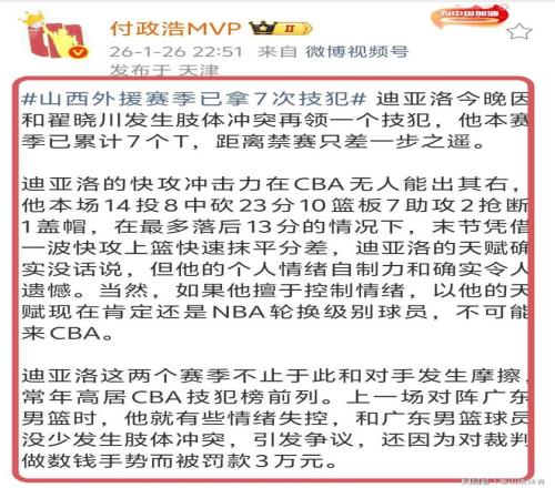 迪亚洛累计7次技术犯规,著名媒体人付政浩发文表示:迪亚洛本赛季已累计7个T,距离禁赛只差一步之遥……迪亚洛的天赋确实没话说,但他的个人情绪自制力和确实令人遗憾。当然,如果他擅于控制情绪,以他的天赋现在肯定还是NBA轮换级别球员,不可能来CBA。迪亚洛这两个赛季不止于此和对手发生摩擦,常年高居CBA技犯榜前列。上一场对阵男篮时,他就有些情绪失控,和广东男篮球员没少发生肢体冲突,引发争议,还因为对裁判做数钱手势而被罚款3万元……