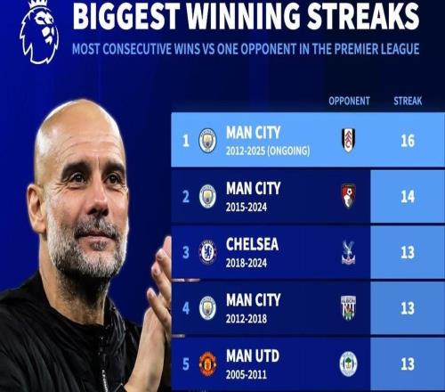 英超对同一球队最长连胜排行:曼城对富勒姆16连胜居首